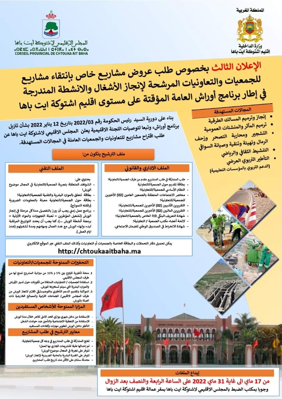 رسميا الاعلان عن طلب اقتراح مشاريع في إطار برنامج ” أوراش” بإقليم اشتوكة آيت باها