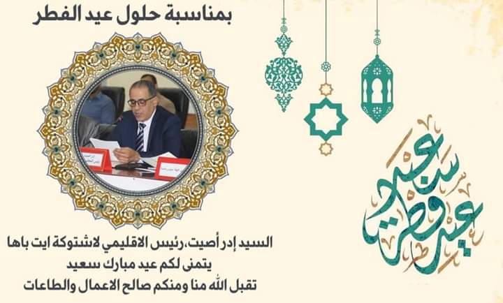 بمناسبة حلول عيد الفطر المبارك يتقدم السيد ادر اوصيت رئيس المجلس الإقليمي لشتوكة ايت باها باسمه الخاص و نيابة عن باقي اعضاء و مستشاري و موظفي المجلس الإقليمي لشتوكة ايت باها ، بأسمى آيات التهاني والتبريكات الى ساكنة إقليم اشتوكة آيت باها وأبناء الجالية المغربية،سائلاً المولى عز وجل أن يتقبل من الجميع صالح الأعمال ويجعلها خالصة لوجهه الكريم .