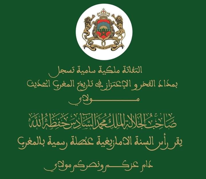 “تفضل صاحب الجلالة الملك محمد السادس، نصره الله، بإقرار رأس السنة الأمازيغية، عطلة وطنية رسمية مؤدى عنها، على غرار فاتح محرم من السنة الهجرية ورأس السنة الميلادية.