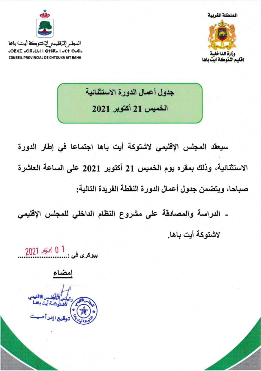 افرج رئيس المجلس الإقليمي لشتوكة ايت باها السيد ادر اصيت عن جدول اعمال الدورة الاستتنائية التي حدد لها تاريخ الخميس 21 أكتوبر الجاري.