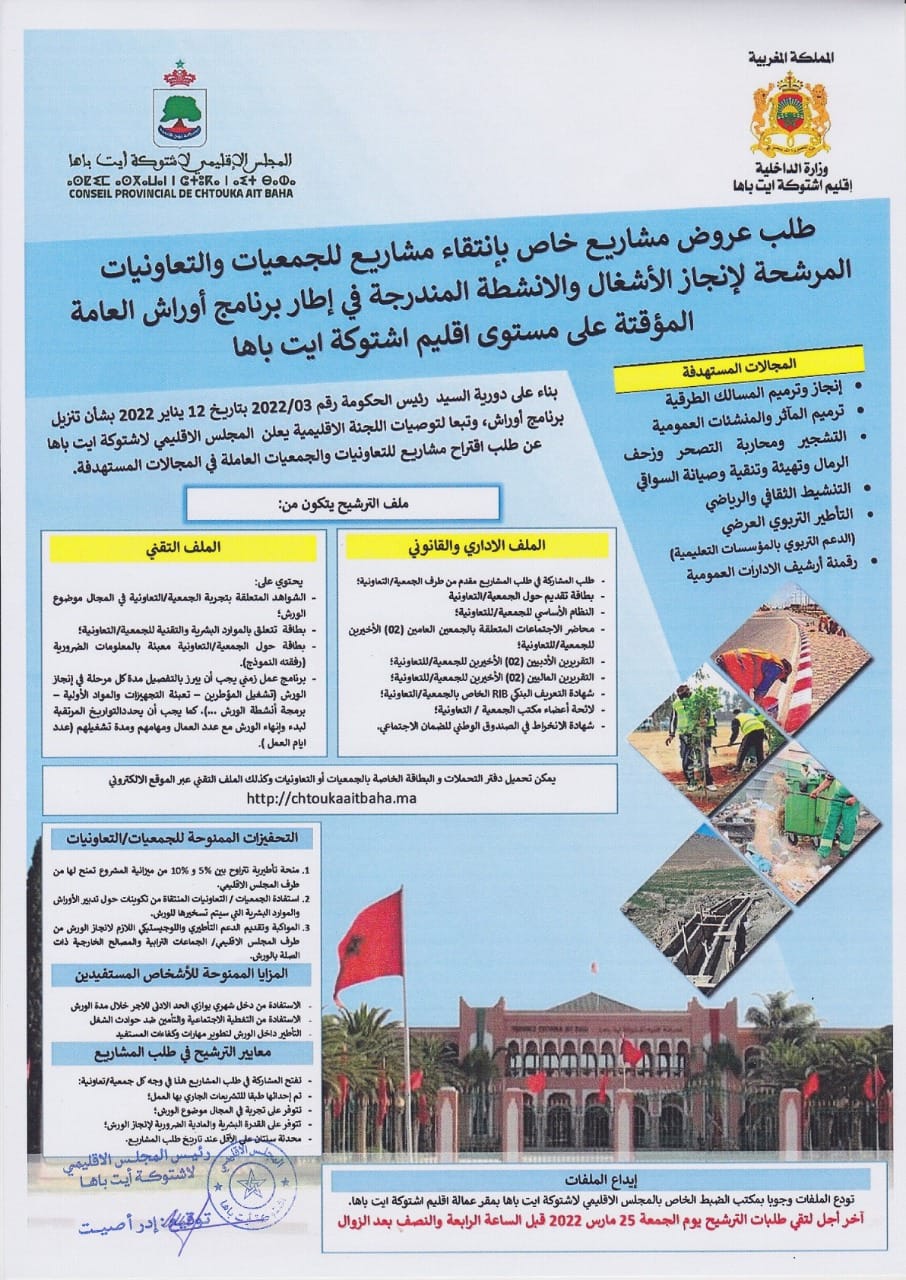 رسميا الاعلان عن طلب اقتراح مشاريع في إطار برنامج ” أوراش” بإقليم اشتوكة آيت باها